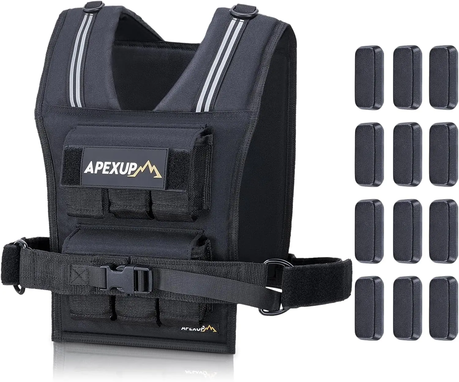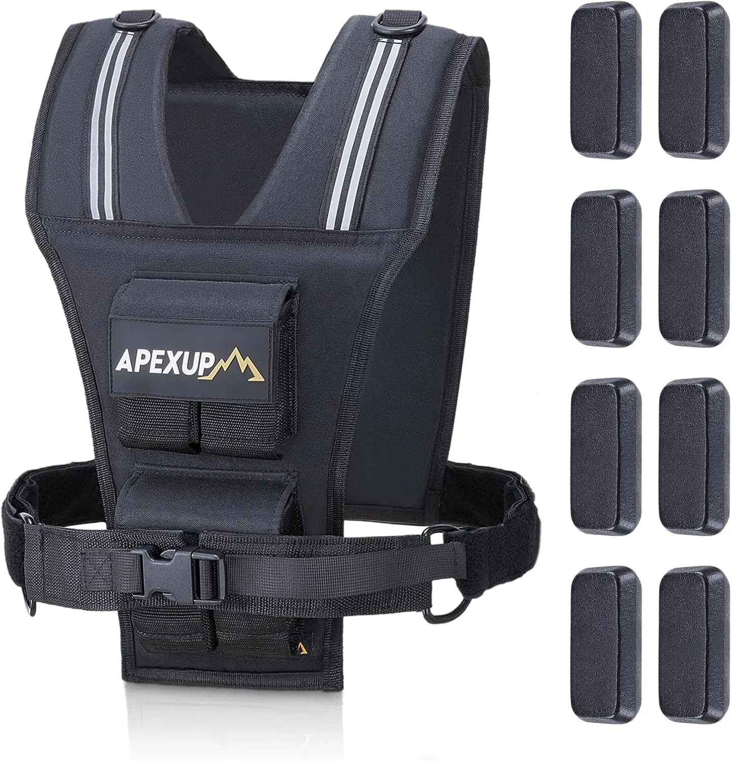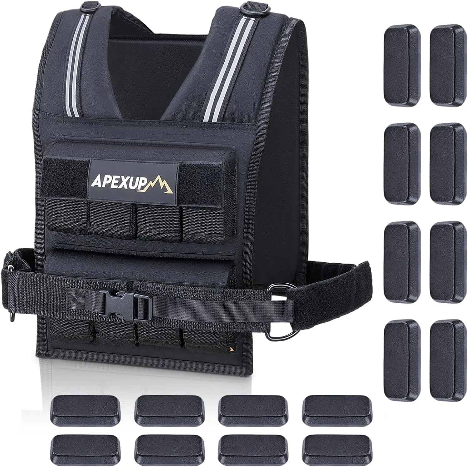 Each individual weight weighs 2.5 lbs and is made from solid cast iron. For optimal comfort and stability, weights should be evenly distributed between the front and back panels, ensuring balanced load and natural movement.