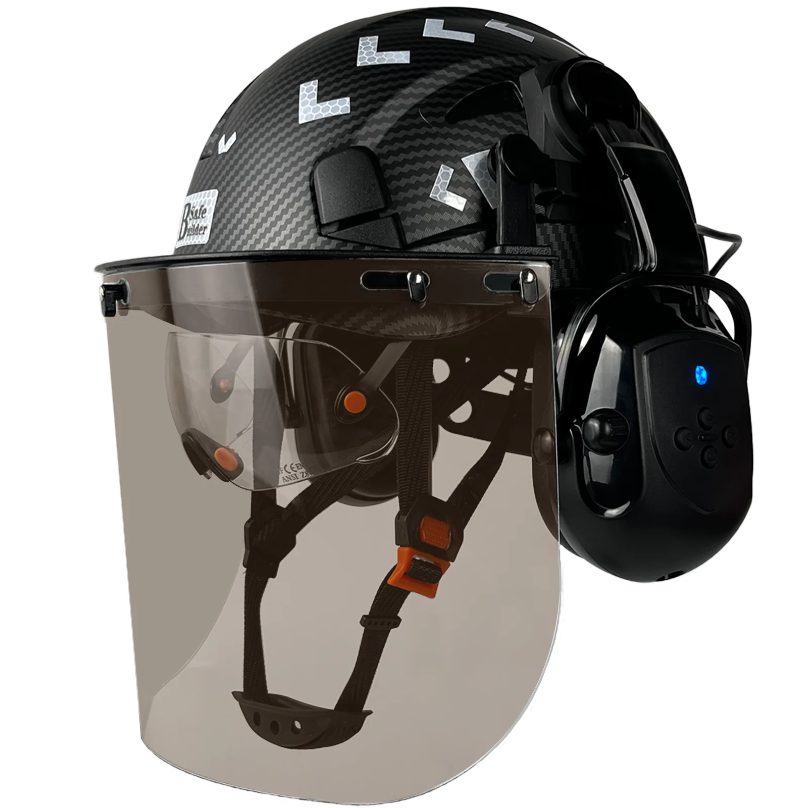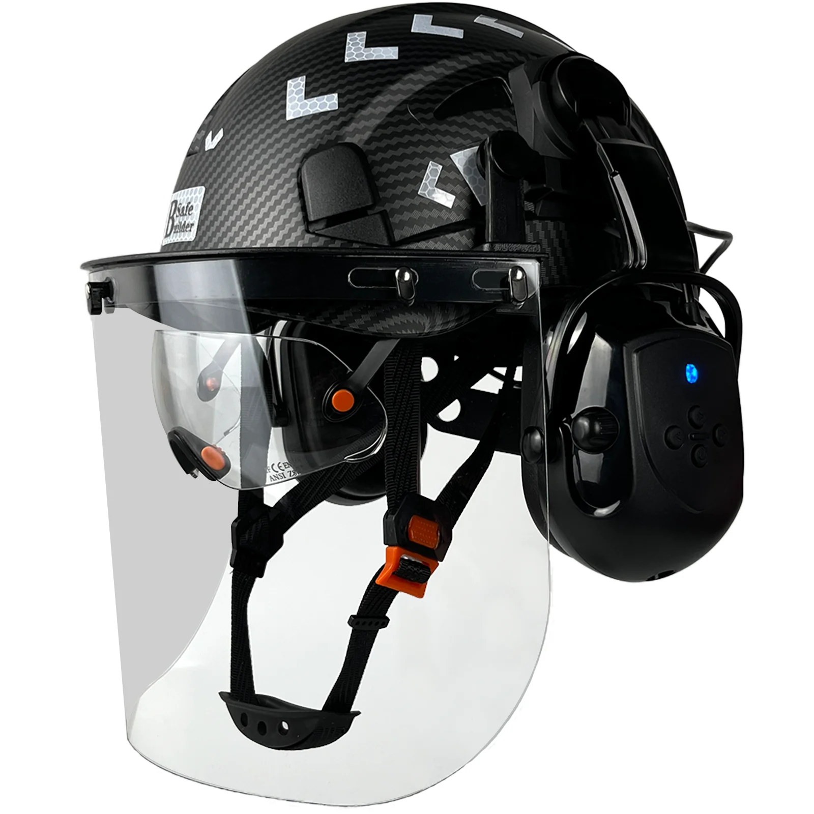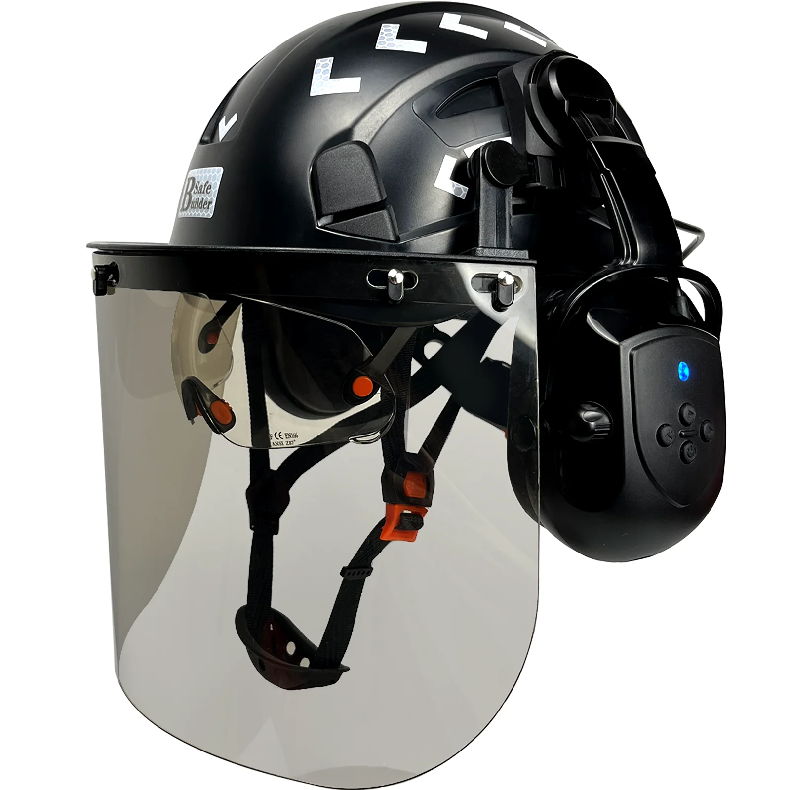 The helmet shell is made from high-strength ABS material for durability and impact resistance. The visor is made from quality PC material for reliable eye protection. The overall construction is designed to support safe use in environments where head, face, eye, and hearing protection are all necessary.