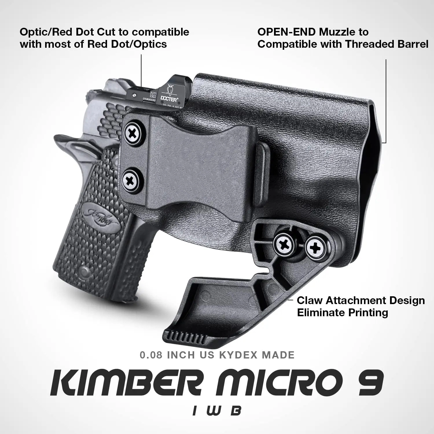 Form Factor and Material Construction The holster shell is thermoformed to match the exact physical dimensions of the Kimber Micro 9. The rigid Kydex polymer prevents the mouth of the holster from collapsing when empty. This structural stability allows the user to re-holster the item safely using only one hand.