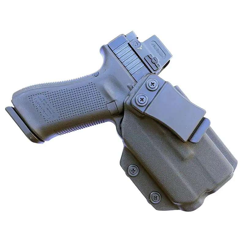 This Inside the Waistband Kydex holster is a light‑bearing design for compact‑frame Glock pistols that share the Glock 19 pattern: Glock 19, 23, 25, and 45. The shell is molded specifically for pistols equipped with an Olight PL‑Mini 2 Valkyrie weapon light. Retention is based on the pistol with the PL‑Mini 2 installed; the holster is not intended for use with bare pistols or other light models.