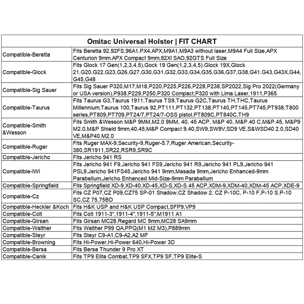 - Glock: 17, 19, 19X, 20, 21, 22, 23 – all variations, 26, 27, 30, 31, 32, 33, 34, 35, 36, 37, 38, 41, 43, 43X, 44, 45, 48 (Gen 1–5)
